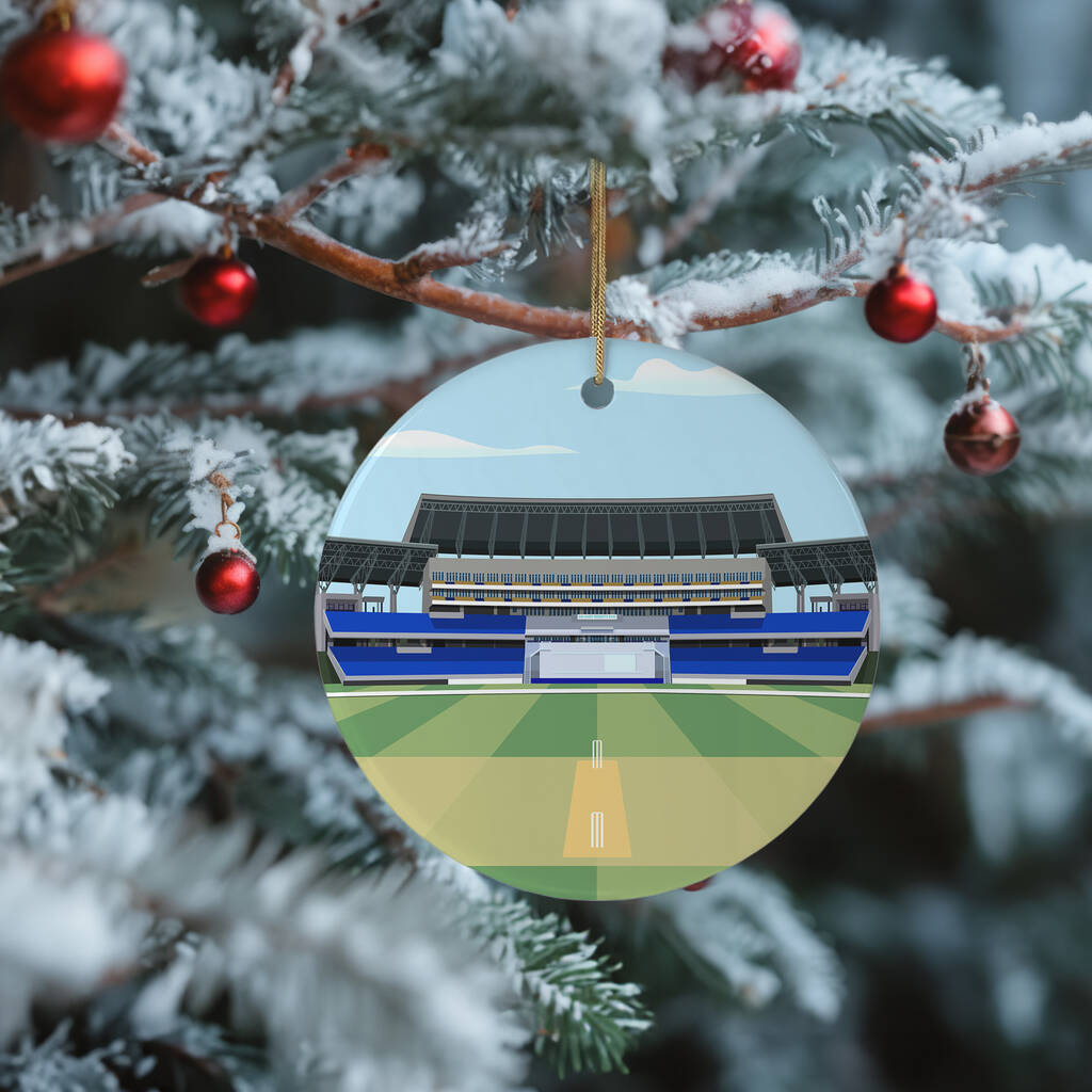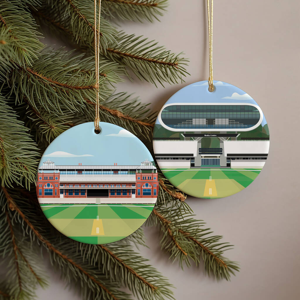 A cricket themed Christmas decoration, featuring an illustration of ANY cricket ground that you request.