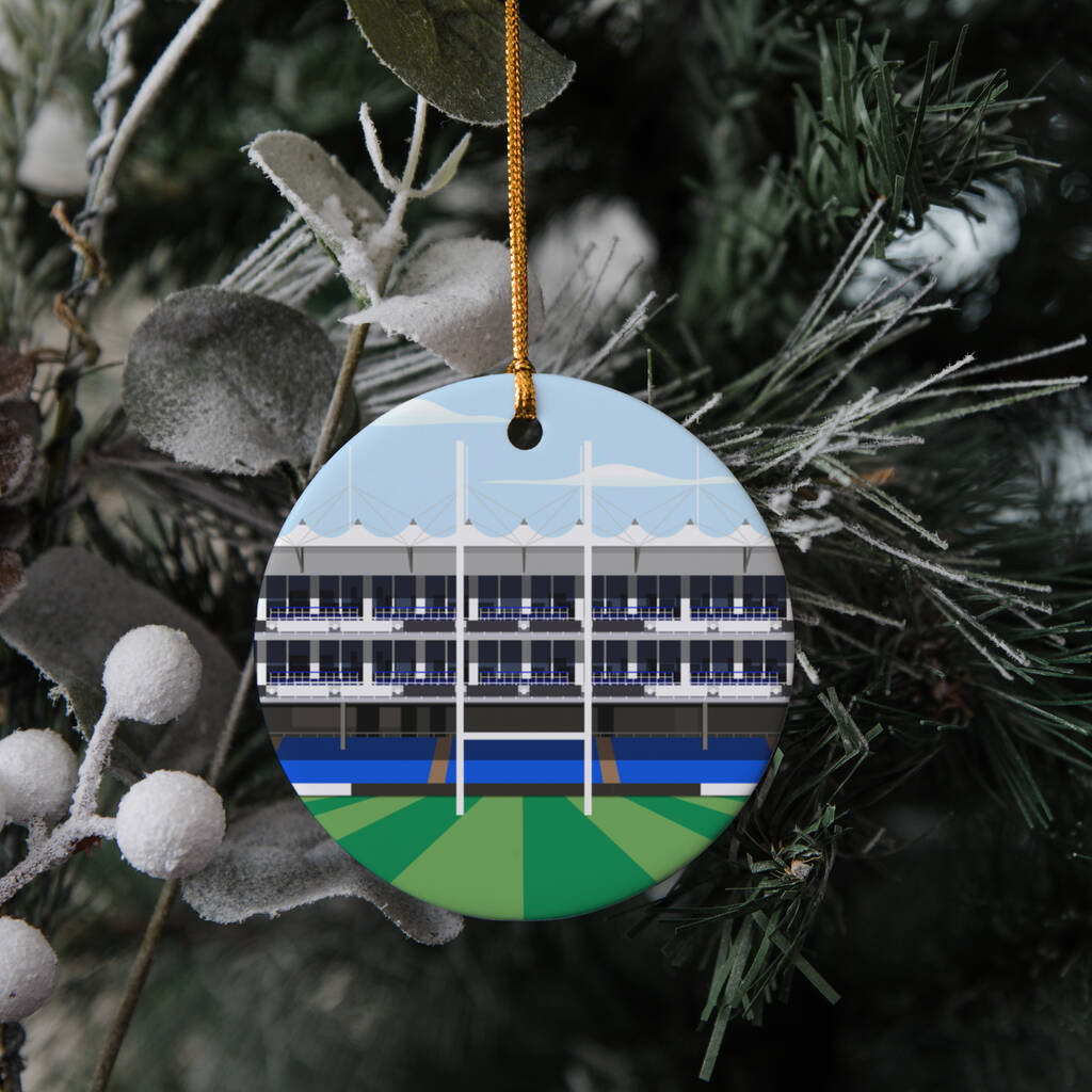A rugby themed Christmas decoration, featuring an illustration of ANY rugby stadium that you request.