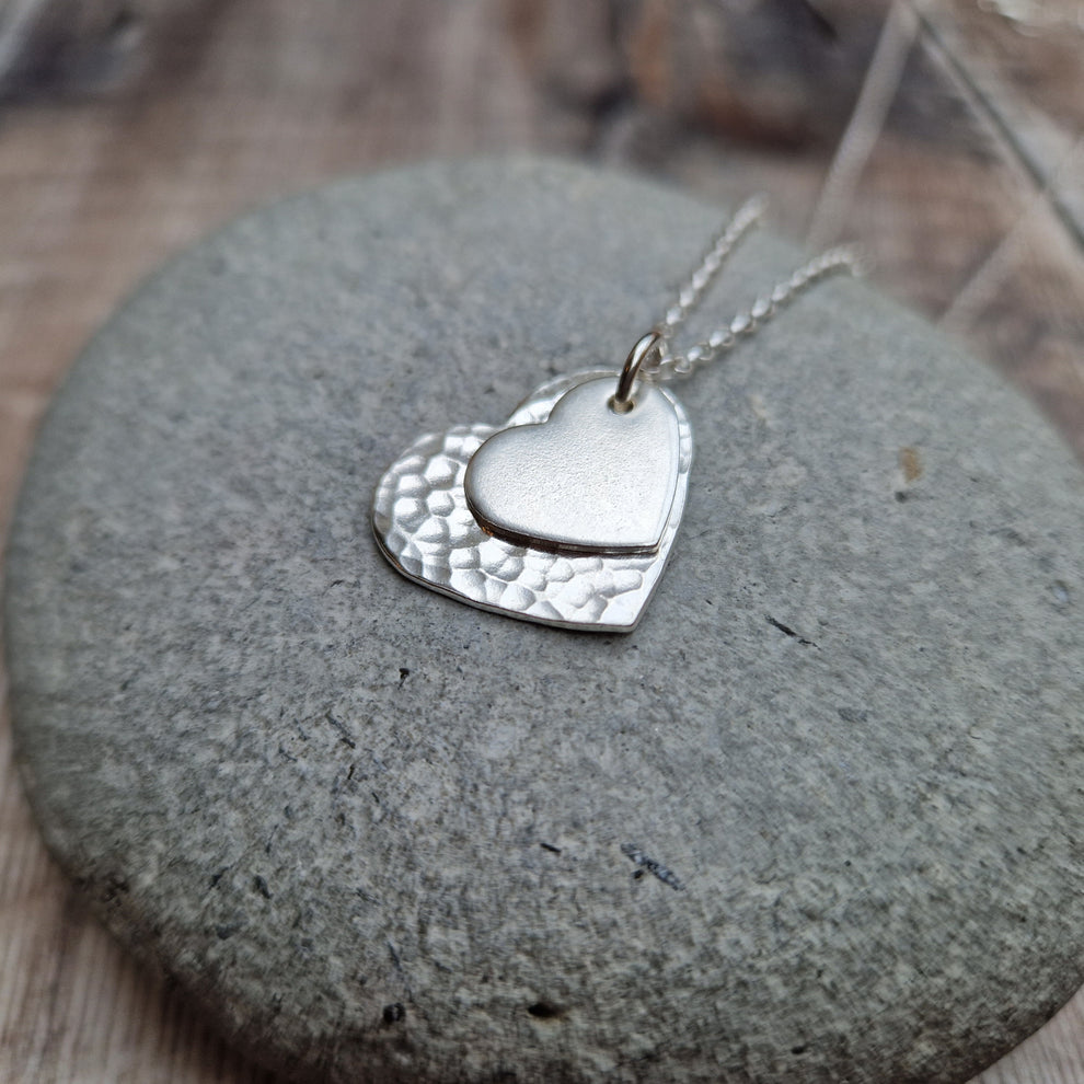 Pretty necklace made from two hand made Sterling Silver heart charms. The larger charm has a hammered finish and the smaller heart charm has a polished finish.