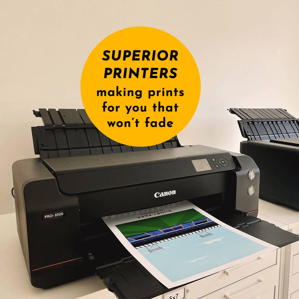 Make it your own and PERSONALISE the print with the text of your choice. Keep it simple by going for the name of the stadium, such as TWICKENHAM or give it a personal touch such as 'DAD'S SECOND HOME'.
